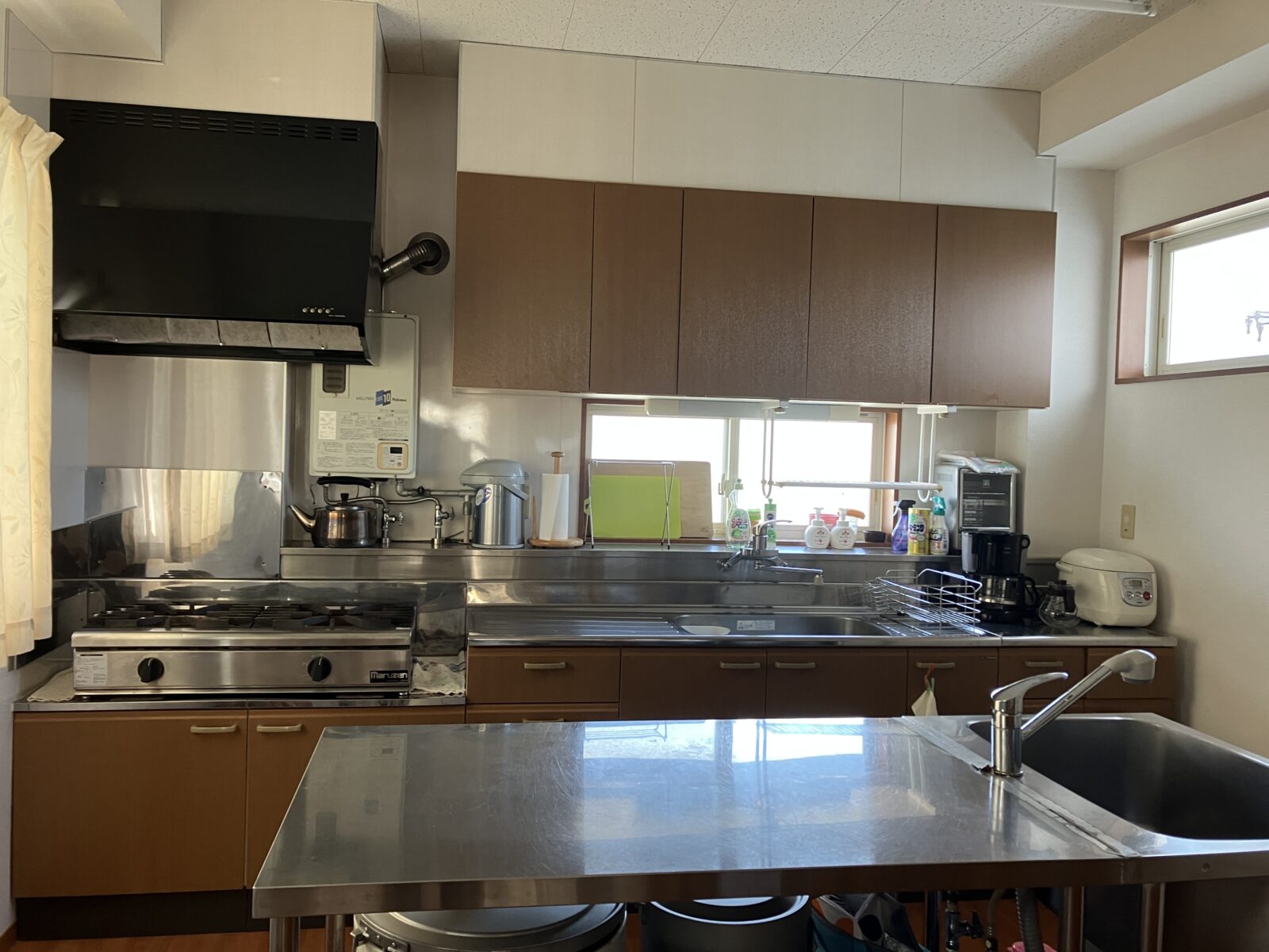 冷蔵庫や電子レンジ、コーヒーメーカー、ガスレンジ、トースター等が一揃いあります。