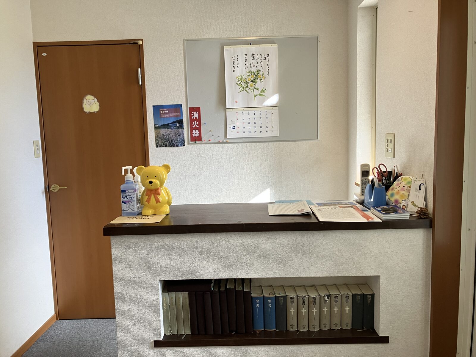 玄関から礼拝堂に続く廊下の奥の左手に、車椅子が入れる一人用のトイレがあります。